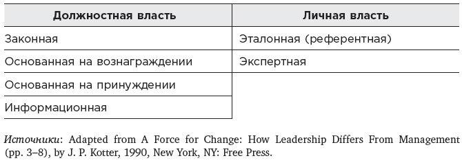 В организациях доминируют два типа власти: должностная и личная. Должностная власть включает несколько форм: законную, информационную, а также виды власти, основанные на вознаграждении или на принуждении (таблица 1.2). Это та власть, которую человек получает, занимая определенную должность или имея звание в рамках официальной системы. Способность влиять на группу появляется у лидера за счет более высокого статуса. Должностная власть выводит лидера на центральные позиции в структуре организации. Так, в силу занимаемой должности, вице-президент или руководитель отдела обладает большей властью, чем штатный сотрудник. Кроме того, неформальные связи повышают их социальную власть, тем самым еще сильнее отдаляя лидеров от последователей (Чиу, Балкунди и Вайнберг, 2017).