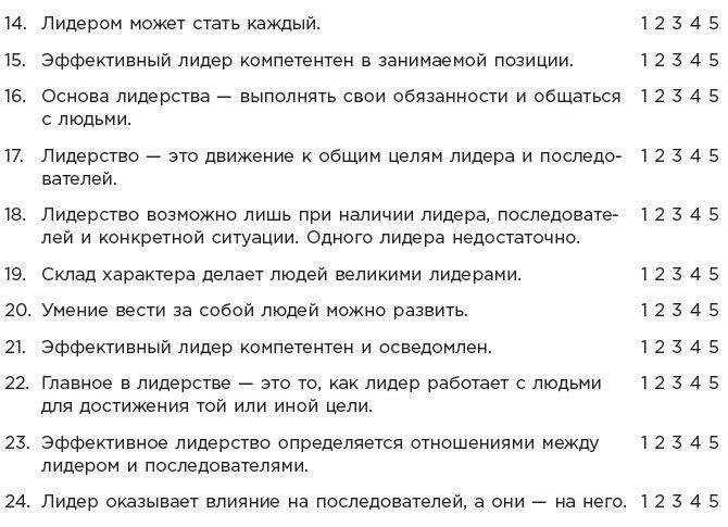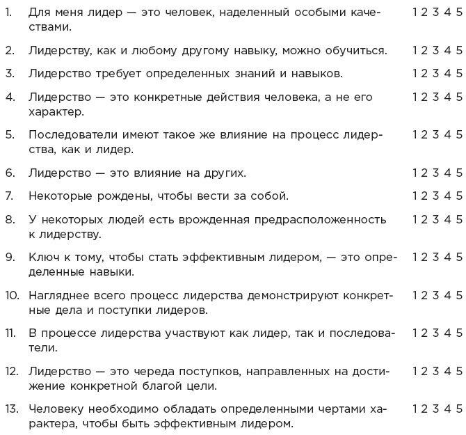 Понятие «лидерство» весьма неоднозначное и включает в себя множество аспектов. Для одних лидерство – это личностная черта или способность, для других – навык или поведение, для третьих – отношения или процесс взаимодействия. Скорее всего, лидерство включает в себя все эти компоненты, и каждый из них отвечает за определенный аспект. Какой подход наиболее близок вашему собственному представлению о лидерстве? Как вы определяете лидерство? Знать ответы на эти вопросы необходимо, ведь от того, как вы воспринимаете лидерство, будет зависеть то, как его практикуете. Предложенный ниже опросник поможет вам найти эти ответы.