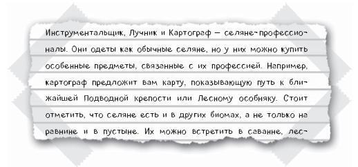 По тропинке я прошёл через лес, преодолел несколько холмов и подошёл прямо к деревне. Она была ОГРОМНАЯ! Если не считать деревни в ледяном мире, это было самое большое поселение, что я видел в «Майнкрафте»! Кучи селян говорили своё «Харр» и ходили туда-сюда. К сожалению, у меня обнаружились проблемы с одной маленькой незначительной деталью… я не знал, какого цвета одежду носят селяне каких профессий!