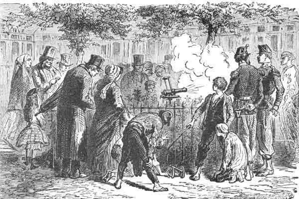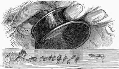 Everything was to be provided for the safety and convenience of the passengers. Around the upper part of the balloon you will see a platform, with sentries and tents. These soldiers were to be called the "air-marines." There is a small balloon—about the common size—which could be sent off like a small boat whenever occasion required. If any one got tired of the expedition, and wanted to go home, there was a parachute by which he might descend. On the deck of the ship, near the stern, was to be a little church; small houses hung from below, reached by ladders of silk, which were to be used as medicine-rooms, gymnasiums, etc.; and under the ship would hang a great hogshead, as big as a house, which would contain provisions and stores, and keep them tight and dry. There was also a kitchen; and a cannon, with which to fire off salutes, besides a number of guns, which you see projecting from the port-holes of the ship. These, I suppose, were to be used against all enemies or pirates of the air, sea, or land.