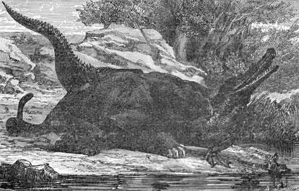 What a dreadful disappointment! Not a deer, or a sign of one, to be seen, and nothing living within a mile. But no! There is something moving! It is—yes, it is a big Alligator, lying down there on the rocks! After looking for a few minutes with disgust at the ugly creature, the Jaguar said to himself, "He must have come on shore while I was asleep. But what matters it! An Alligator! Very different indeed from five fat young deer! Ah me! I wish he had not that great horny skin, and I'd see if I could make a supper off of him. Let me see! There is a soft place, as I've been told, about the alligator! If I could but manage and get a grip of that, I think that I could settle old Mr. Hardskin, in spite of his long teeth. I've a mind and a half to try. Yes, I'll do it!"