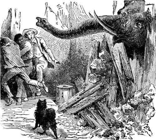 For instance, an Elephant which was on exhibition in this country had a fast and true friend, a little dog. One day, when these animals were temporarily residing in a barn, while on their march from one town to another, the Elephant heard some men teasing the dog, just outside of the barn. The rough fellows made the poor little dog howl and yelp, as they persecuted him by all sorts of mean tricks and ill usage. When the Elephant heard the cries of his friend he became very much worried, and when at last he comprehended that the dog was being badly treated, he lifted up his trunk and just smashed a great hole in the side of the barn, making the stones and boards fly before him.