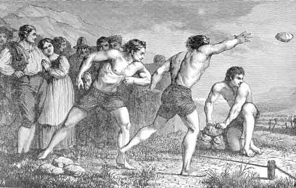 These hammers are not exactly what their name implies, being heavy balls of brass or iron, fitted to a long handle. The hammer is whirled around the head several times and then thrown as far as possible. The man who throws it to the greatest distance wins the game.