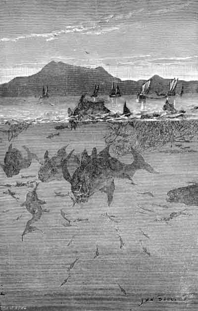 The Shark, as you all know, is the most ferocious and dangerous of all the fishers in the sea. He considers anything suitable for a meal which will go into his mouth; he will eagerly snap at a man, a mouse, or even a tin coffee-pot, or a band-box. So savage and relentless is this "tiger of the sea" as he is sometimes called, that it is gratifying to think that he occasionally goes out fishing and gets caught himself. Many instances have been related of natives of the Pacific Islands, who are accustomed to bathe so much in the ocean that they swim almost like fishes themselves, who have successfully given battle to Sharks which have pursued them. The Shark is unable, from the peculiar formation of his mouth, to seize the man, unless he can turn partially over. Therefore the man takes care to keep below the Shark, and a few stabs with his long knife are generally sufficient to finish the combat, and to slay the monster.