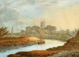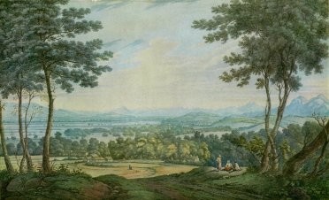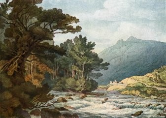 The work of Francis Towne has only of recent years come to be appreciated. He belonged to a Devonshire family, but the exact place of his birth is not known. He became a friend of William Pars, A.R.A., from whom he received some instruction in drawing, and also went with him to Rome in 1780. Although he spent considerable time on the Continent, numerous drawings by him exist of scenes in his native country. On the Dart (Plate II) is a good example of his delicate method of painting. His special skill lay “in the management of even pen-line and in a subtle modulation of colour upon a flat surface.”