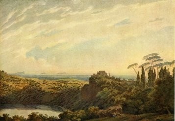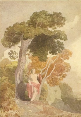 John Robert Cozens, the son of Alexander Cozens, was the first artist at this period “to break away from the trammels of topography, and to raise landscape painting in water colours to a branch of fine art.” He travelled abroad and studied principally in Italy and Switzerland. The lake of Nemi, situated in the Campagna, some sixteen miles west of Rome, and reached by the famous Via Appia, has always been a favourite subject with both poets and artists. Near the north rim of the worn-out crater, in which the lake is situated, is the village of Nemi, surmounted by a fine old castle, which passed through the hands of many noble families. Pope, Byron, and others have sung the praises of the lake. Turner has left at least five drawings of it, one of which is engraved in Hakewell’s “Italy.” William Pars, Richard Wilson and other artists of the early landscape school also painted the scene. Cozens made many drawings of Nemi and the vicinity. Two are in the Victoria and Albert Museum and another is in the Whitworth Institute, Manchester. The painting (Plate X), belonging to Mr. R. W. Lloyd, shows the lake with Palazzo Cesarini on a height by its side, and the Campagna in the distance. It is a fine example of Cozens’ work treated in his poetic manner, and into which more colour than usual has been introduced. Cozens’ last visit to Italy was made in 1782 in company with the noted William Beckford, the author of “Vathek.” On his return he gradually lost his reason. It is pathetic to think such was the sad end of a man inspired with such artistic talents. As it has already been stated, he was the pioneer in exalting water-colour painting to a fine art. His footsteps were quickly followed by Girtin and Turner. The history of these two artists, how during their early struggles they were befriended by that art patron, Dr. Thomas Monro, a capable water-colour painter himself, and well qualified to give advice, is too well known to need repetition.