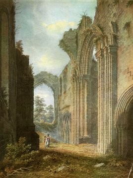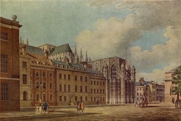 Thomas Hearne was a contemporary with Rooker. It was a custom at this period for topographical artists to travel abroad with British Embassies to foreign countries and with Governors to Colonial possessions. Photography had not yet been invented, and the drawings by these artists were the only means by which the majority of inhabitants of this island were able to obtain some idea of places beyond the sea. Hearne went to the Leeward Isles, as draughtsman to the Governor, and produced records of the scenery there. Afterwards he executed a number of drawings in this country, some of which were engraved in “Antiquities of Great Britain.” View of Gloucester (Plate IV) is an example of his accurate drawing, though somewhat weak in colouring. Joseph Farington, R.A., received instruction in drawing from Wilson, and his paintings show slight evidence of it, as may be seen from the Scotch Landscape (Plate V), but he simply copied Nature without enduing his work with any of his master’s poetic reeling. Thomas Malton, Junr., was noted for the accuracy with which he drew architectural views, many of them being street scenes in London, and they are of considerable value as records. Old Palace Yard, Westminster (Plate VI) is interesting as showing buildings on the north side of Henry VII’s Chapel of the Abbey, which have long since been demolished. He published works aquatinted by himself, including Westminster, which appeared in 1792. He held classes at which Girtin and Turner attended. The latter used to say, “My early master was Tom Malton.” Edward Dayes was a versatile artist; he painted architectural subjects, into which he frequently introduced figures, such as Furness Abbey (Plate VII), executed miniatures and engraved in mezzotint. He also wrote several works on art. Buckingham House, St. James’s Park, in which a number of the beau monde are seen promenading in the park, is one of his best paintings. An engraving of it by F. D. Soiron, produced in 1793, under the title of Promenade in St. James’s Park, was very popular.