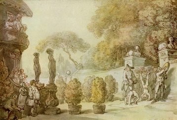 The reputation of Thomas Rowlandson, who could paint landscapes with great ability, rests upon his caricatures, which were usually drawn in outline and tinted. He lived a somewhat dissipated life, and possessed an abundant sense of humour, as displayed in the Entrance to Vauxhall Gardens (Plate IX), the noted place of amusement and rendezvous of the fashionable set in the early part of the last century.
