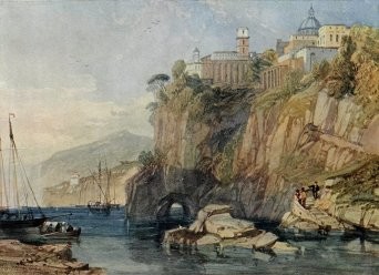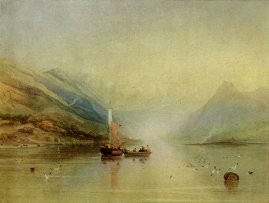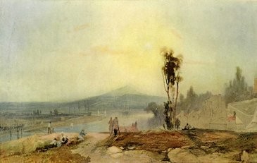 James Baker Pyne, born at Bristol, was a self-taught artist. He also is noted for his brilliant colouring, but there is a want of solidity in his painting. He visited the Continent and travelled as far as Italy (see Plate XXIII). His landscapes were chiefly river and lake subjects. He published “The English Lake District” and “The Lake Scenery of England,” illustrated with lithographs of his works. He was a member of the Society of British Artists, and became a vice-president. Like Girtin, the illustrious young painter Richard Parkes Bonington was cut off in life at the early age of twenty-seven. He was born at Arnold, near Nottingham. Whilst still a boy he was taken by his parents to Calais, where he received some instruction in water colours from Francia. Later the family settled in Paris. Here Bonington resided the greater part of his life. He made a few visits to England, and on the last occasion he was taken ill and died of consumption. He practised at the Louvre and the Institut, and also received instruction from Baron Gros. His paintings, in oil and water colours, were almost entirely executed in France; he, however, made one visit to Italy. In Paris his works were chiefly architectural with street scenes, admirably executed, whilst his landscapes with fine atmospheric effects (see Plate XXIV) display great freedom in execution. It is somewhat remarkable that after Cotman and Bonington had, in the first part of the nineteenth century, developed a style so greatly appreciated at the present time, so many of the landscape painters in water colours in the early Victorian era should still have adhered to the old restricted methods. Constable exercised considerable influence on the French landscape painting in oil, whilst Bonington showed the French artists the capabilities of water colours, which they did not fail to appreciate.