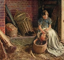 James Duffield Harding, like Prout, from whom he received some lessons, also excelled in lithography. Many of his paintings were reproduced by him in a publication entitled “Sketches at Home and Abroad.” He visited Italy on two occasions. Vico, in the Bay of Naples, between Castellamare and Sorrento (Plate XX), is an example of his free manner of painting. An engraving of it appeared in the “Landscape Annual” in 1832. He was a member of the “Old” Society, and also painted in oils. William Henry Hunt, familiarly called “Old” or “Billy” Hunt in his latter years by his fellow artists, to distinguish him from William Holman Hunt, was an artist with a style peculiar to himself. He painted figures, especially young rustics, with a sense of humour, but he is chiefly noted for his exquisite fruit and flower pieces, which were executed with great delicacy and with a remarkable power of rendering the effects of light and shade on the surface of the objects. To obtain these he would roughly pencil out, say, a group of plums, and thickly coat each one with Chinese white, which would be left to harden. On this ground he afterwards painted his colours with a sure hand. By this means he would obtain a brilliant effect. Further, to enhance it, he would make free use of the knife on the various surroundings to give a contrast, and at the same time to produce a feeling of texture on the various surfaces, so as not to have a monotonous and flat appearance. This method of scraping up portions of the surface of the paper is clearly shown in Plucking the Fowl (Plate XXI).