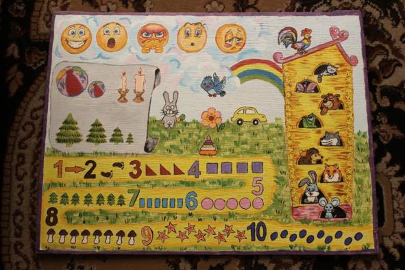 Воспитатель из кратковременной группы, зная, что я рисую, попросила меня оформить им доску, закрывающую ящик с песком для рисования. В качестве идеи она предложила некоторые наработки: например, изобразить большой предмет и рядом маленький, высокий и низкий, широкий и узкий и т. д. Краски у меня от картин оставались, правда в небольшом количестве, но я стала с удовольствием заниматься оформлением доски. Позже, Елена Геннадьевна — первая и самая любимая воспитательница Гоши, сказала, что это память им обо мне и моем сыне на долгие годы.