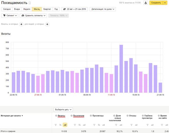 Яндекс. Метрика → Отчеты → Стандартные отчеты → Посещаемость: