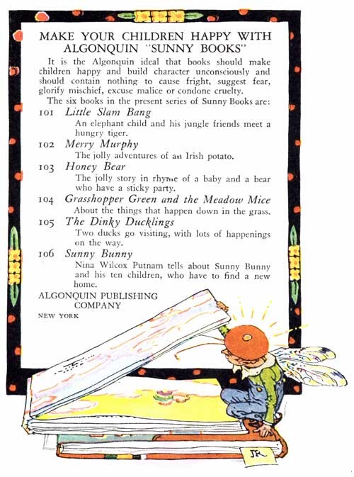 Nina Wilcox Putnam tells about Sunny Bunny and his ten children, who have to find a new home.
