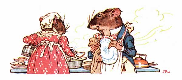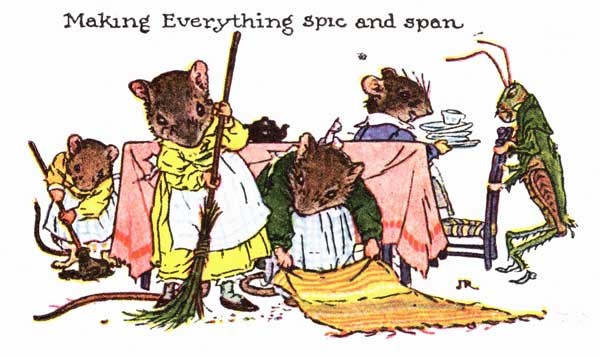 So Long-Tail, Sharp-Eyes, Pink-Ears and Mouseykins all put on funny little blue aprons and fell to work, and in a very short time the dishes were all washed and dried and the room was as neat as a new pin.