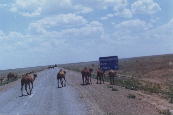 Вчера мы узнали бизнес-секреты перевозки арбузов, а сегодня нам повстречались перегонщики лошадей. Большой табун, голов 100, показался на горизонте, и вот вскоре на трассу выехали пастухи – два казаха, в окружении перегоняемого товара. Лошади, купленные в Павлодаре (на севере Казахстана) примерно по $700, почти добровольно направлялись своим ходом в Алматы, не зная, что там их оптом сдадут по $1000 на мясокомбинат. В день табун проходит 20—30 километров, стало быть перегон длится очень долго, от месяца до двух. Подъехал и хозяин лошадей, очень жирный казах 120 кг весом на широком жирном джипе. Вылез, поглядел, как идёт перегон, и поехал завтракать в посёлок.
