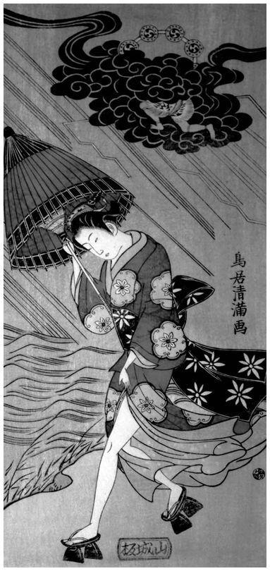 Тории Киёмицу. Женщина, застигнутая штормом. В облаках – изображение Райдзина. XVIII в.