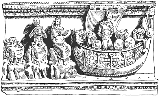 Рис. 2. Барельеф, украшающий фронт саркофага в Вольтерре, II в. до н. э. Улисс слушает пение сирен.