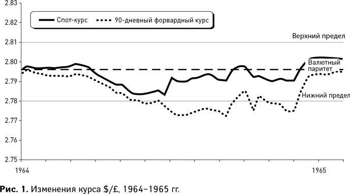 В 1965 г. фунт стерлингов был привязан к доллару США с паритетом $2,80 = £1,00. Это соотношение действовало согласно Бреттонвудскому договору с 1944 г. (см. вставку А). Паритеты валют определялись совместно Международным валютным фондом и центральным банком соответствующей страны. Паритеты считались официальными обязательствами центральных банков и изменить их было достаточно сложно. Время от времени некоторые страны, прежде всего, Франция, проводили девальвацию/ревальвацию в пределах 10–25%, изменяя паритеты валют по отношению к доллару США, который в то время являлся ключевой валютой мировой денежной системы.