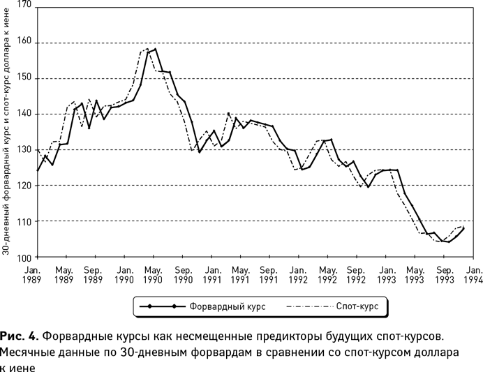Форвардные курсы в целом рассматриваются как несмещенные предикторы (в статистическом смысле) будущих спот-курсов. Безусловно, это не означает, что форвардный курс предсказывает, какими спот-курсы будут в точности через 30, 60, 90 или 180 дней. Однако он указывает на то, что срединное или ожидаемое значение случайной величины, представляющей будущий спот-курс, представляет собой текущий форвардный курс. Со временем фактический будущий спот-курс окажется выше или ниже текущего форвардного, но алгебраическая сумма ошибок прогнозирования, определяемая как разность между форвардным курсом, существующим в момент времени 0 для поставки в момент времени t, обозначаемым F (0, t), и будущим спот-курсом S (t), существующим в момент времени t, или F (0, t) — S (t), стремится к нулю. И здесь мы вновь видим, что факты указывали на укрепление, а не ослабление иены (см. рис. 4).