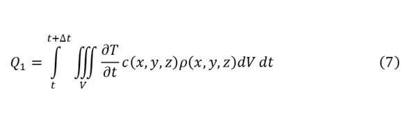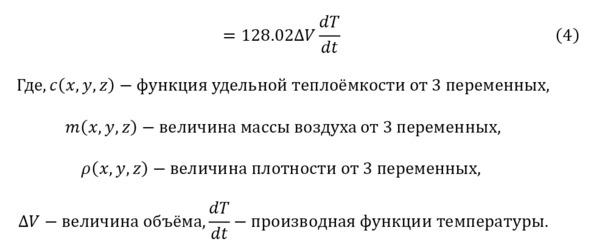 В описанном пространстве имеется единый источник тепла, с известными координатами и величиной энергии. Зная указанные значения в аналитическом виде, можно вычислить теплоёмкость всего воздуха в помещении (4), величину проходящей через произвольную виртуальную плоскость с известной площадью в этом пространстве (5) и температуру в любой точке этого пространства (6), что следует из (4).