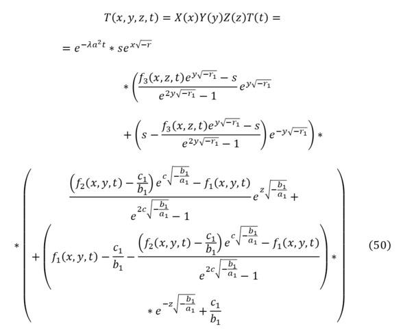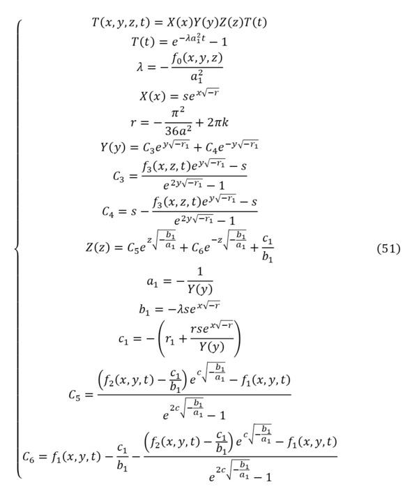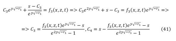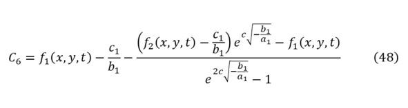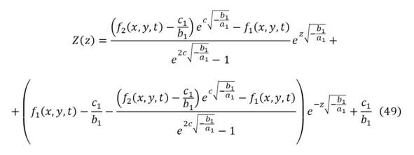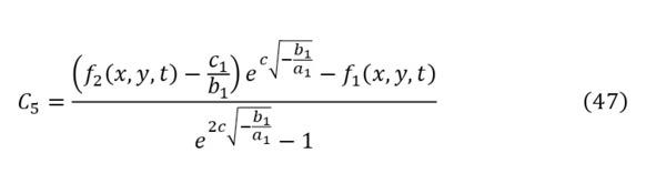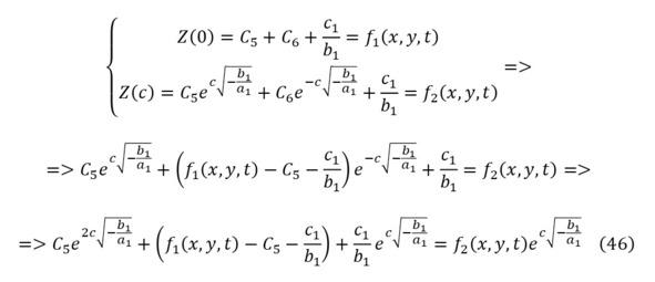Используя граничные условия также находятся значения для постоянных неизвестных коэффициентов (46), получая значение для первого коэффициента (47) и второго (48), получая конечное значение уравнения для третьей переменной (49).