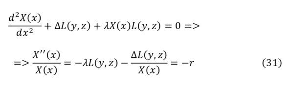 Продолжение решения задачи, переходит к пространственной форме (29), где выражается вновь представление через разделение переменных (30), откуда можно составить преобразование вида (31), которое превращается в равенство с новым собственным значением, откуда уже можно получить обыкновенное дифференциальное уравнение второго порядка для первой переменной (32).