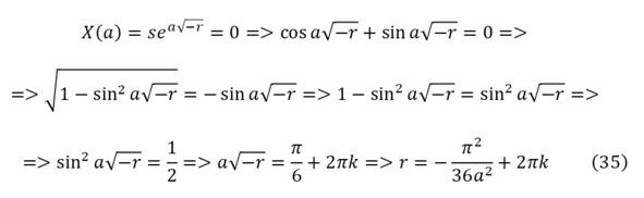 Остаётся найти собственное значение этого уравнения, для чего применяется (35), после чего полученный результат в (34) подставляется во вторую часть (31) получая (36), как новое дифференциальное уравнение с новым разделением оставшихся переменных (37).