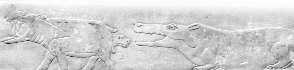 На этом древнеегипетском изображении нильский крокодил готовится напасть на рожающую самку гиппопотама.