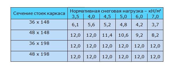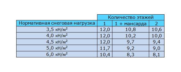 1. Значения, приведённые в таблице 9.1. предусматривают конструкцию кровли из свободно опертых ферм, т.е. нагрузки с кровли в этом случае передаются только на наружные несущие стены. В таблице 9.1 мы видим, что здание с такой конструкцией кровли и каркасом несущих стен из доски 36×148 мм может иметь максимальную ширину 5,2 м в регионах с нормативной снеговой нагрузкой 4,5 кН/м². Если же каркас стены собрать из доски 48×148 максимальная ширина дома в этом случае составит 11,4 м.