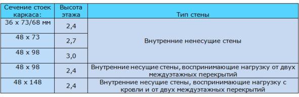 Таблица 9.3 показывает рекомендованные сечения стоек для деревянных каркасных внутренних стен в малоэтажных деревянных каркасных домах, построенных по настоящей норвежской технологии.