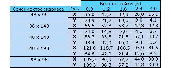 Сечение стоек высоких каркасных стен также должны рассчитываться опытным инженером. Чем выше высота стоек, тем большее значение имеет нормативная ветровая нагрузка и тем больше фактический прогиб стоек. Толщина стоек в высоких каркасных стенах должна быть не меньше 48 мм.