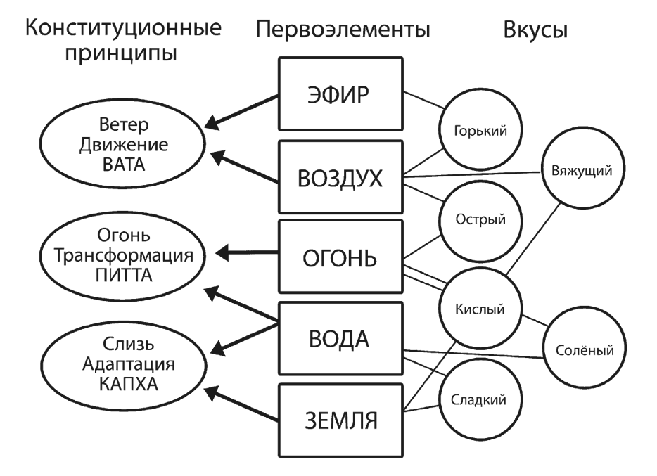 Вата-дошу образуют первоэлементы Воздух и Эфир, Питта-дошу – Огонь и Вода, Капха-дошу – Вода и Земля. Эфир и Воздух – холодные, сухие, подвижные, шершавые, лёгкие по своей структуре, поэтому и Вата-доша имеет эти качества. Питта – горячая, острая, лёгкая, маслянистая, немного влажная, так как образующие её Огонь и Вода имеют эти свойства. И наконец, тяжёлые, медленные, холодные, маслянистые, влажные, плотные Вода и Земля образуют Капха-дошу.