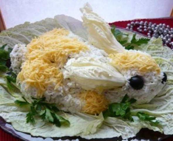 Приготовление: куриное филе порезать маленькими кубиками. Лук порезать мелкими кубиками. Огурчики порезать таким же образом. Половину сыра натереть на крупной тёрке для салата, а вторую половину — на мелкой для украшения. Яйца разделить на белки и желтки. Желтки потереть на крупной тёрке для салата, а белки — мелкой, для кроличьей шубки. Салат смешать в глубокой миске, заправив майонезом. Весь салат выложить на большую тарелку и придать ему форму кролика. Обмазать сверху белком — это будет мех кролика. Глаза и нос из чёрных оливок. Тёртым сыром нанести пятна. Из пекинской капусты достать два самых маленьких листа — это будут уши. Тарелку застелить листьями капусты или салата, украсть зеленью и овощами.