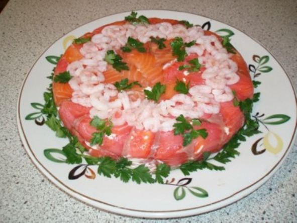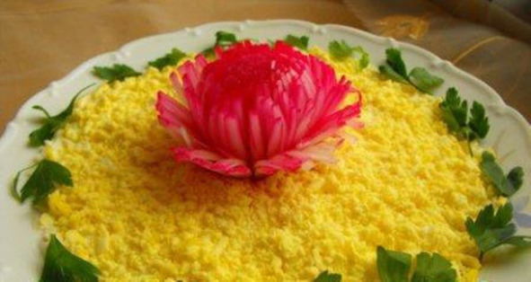 Приготовление: печень трески размять вилкой и уложить на дно салатника. Морковь натереть на мелкой тёрке и уложить поверх печени. Посыпать сыром, натёртым на мелкой тёрке. Смазать майонезом. Яйца очистить и отделить белки от желтков. Белки натереть на мелкой тёрке, выложить поверх сыра и смазать майонезом. Посыпать натёртым на мелкой тёрке желтком. Чтобы сделать хризантему, луковицу разрезать на части, не дорезая до основания примерно 0,5 сантиметра. В подходящую ёмкость налейте воду комнатной температуры добавив, при желании немного сахара уксуса. Поместите луковицу в воду, вода должна закрывать луковицу полностью. Через 1—2 часа «хризантема» из лука должна раскрыться. Окрасьте её свекольным соком и поместите на салат.
