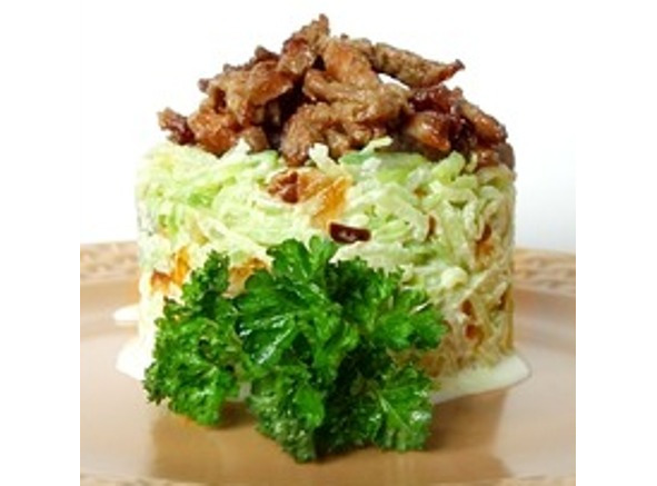 Приготовление: редьку очистить и натереть на тёрке для корейской моркови. Посолить, слегка помять руками и оставить на 10—15 минут. Слегка подмороженную говядину нарезать тонкой соломкой поперёк волокон и обжарить на растительном масле до готовности, предварительно посолив и поперчив. Лук мелко нарезать и обжарить на растительном масле до золотистого цвета. Майонез смешать с мёдом. Редьку отжать от образовавшегося сока и добавить к ней мясо и лук. Заправить майонезом с мёдом, поперчить и подавать, обложив зеленью.