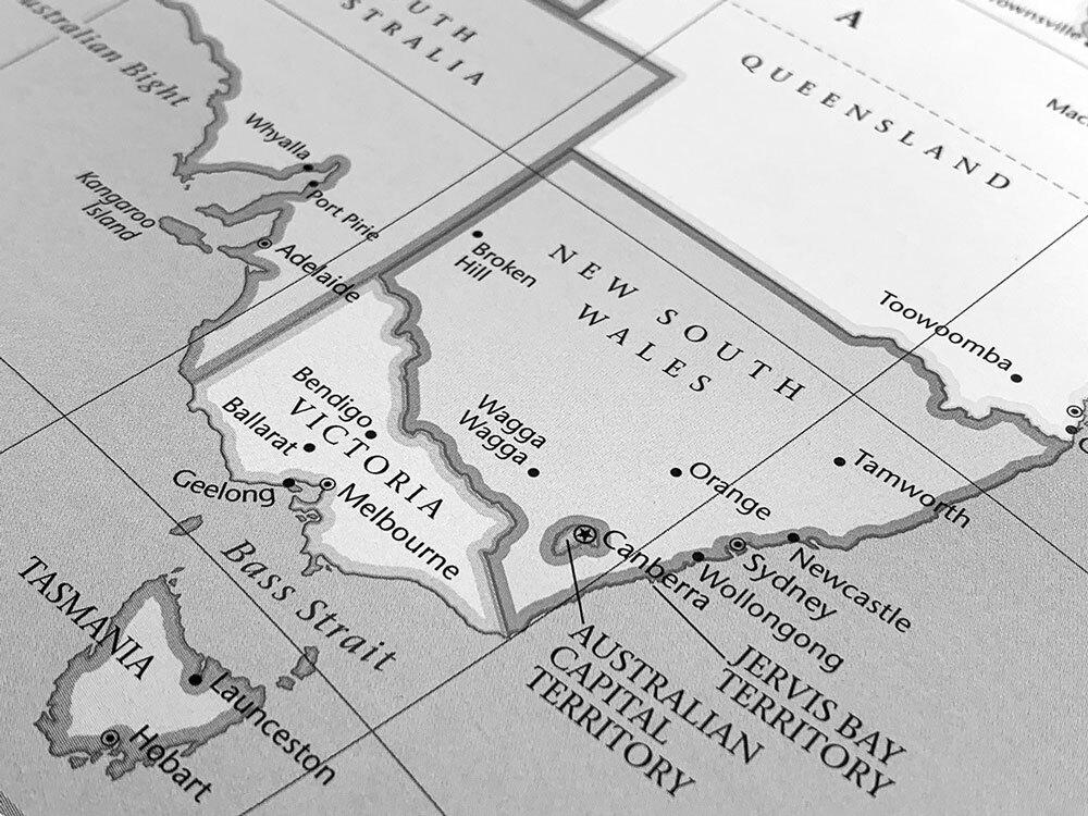 На карте показаны юго-восточные штаты Австралии – Тасмания, Виктория и Новый Южный Уэльс