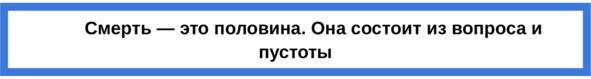 Смерть как важное. Смерть как основное. Смерть как смысл жизни. Смерть как произрастание. Я написал «смерть как…» и не смог поначалу обозначить как что. Она по сути всегда «как». Она не бывает «смерть есть то-то». Если она что-то и есть, то она половина. Половинчатое представление, состоящее из вопроса и пустоты. Этот вопрос и составляет основную суть терзаний, так как ответом на него является лишь пустота. Поэтому смерть это половина.