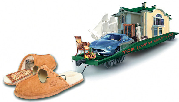 Для рукодельных особ мы разработали на тапочки навесное оборудование: солнечные очки, брелок, кармашки для кредитной карточки и для зажигалки, ковровые стельки и сзади, прикрепленные к задникам, на цепочке на маленьких платформах передвигаются за тапочками домик, машинка, дачка, яхта, и т. п. по желанию заказчицы или заказчика.