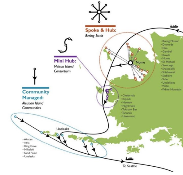 2. Система мини-хабов: каждое поселение, расположенное на побережье, работает как отдельный мини-хаб и отправляет мусор на транспортировку дважды в год (в зависимости от расписания остановок баржи в Сиэтл). В этот район входят такие пункты как Чефорнак, Кипнек, Ньюток, Найтмут, Токсук Бэй, Танунак Умкумиут. Типичный пример — консорциум острова Нельсон.