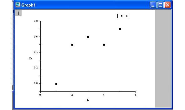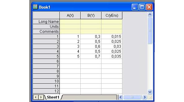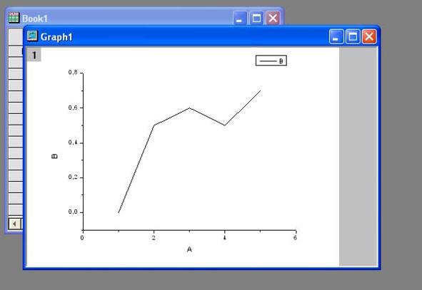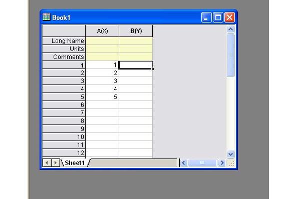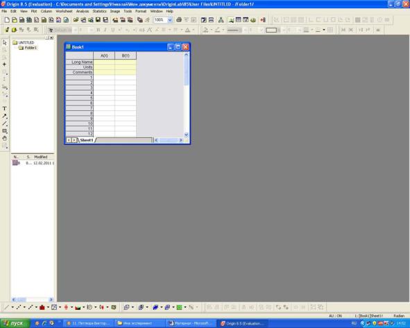 Теперь можно начинать работать с проектом. По умолчанию формируется рабочая книга Book 1, в которую нам надо ввести данные таблицы 1. Столбец A(X) предназначен для ввода аргумента, а столбец B(X) для ввода функциональной зависимости. Для ввода значения необходимо кликнуть на конкретной ячейке рабочей книги и ввести число. Для примера смотреть рисунок 1.3.