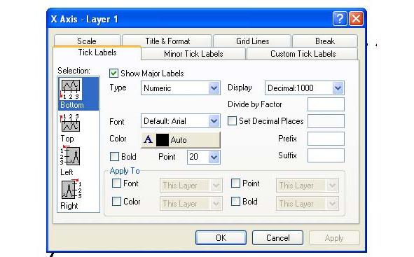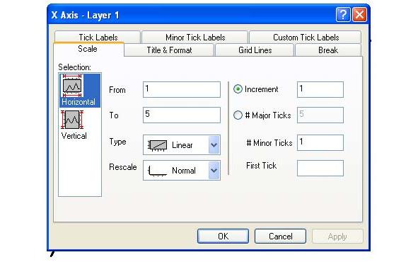 В открывшейся вкладке установите начальное и конечное значение аргумента From — 1, To — 5. Установите приращение аргумента Increment (шаг, с которым будут отображаться значения аргумента под горизонтальной осью). Пусть приращение аргумента будет равно Increment — 1. Установите количество второстепенных делений на шкале горизонтальной оси. Пусть # Minor Ticks — 1. Нажмите Apply. Затем выберите вкладку Tick Labels (см. рис. 1.9).