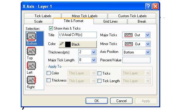 В открывшейся вкладке введите размер цифр на оси аргумента, например Point — 20. Нажмите Apply. Откройте вкладку Title & Format (см. рис. 1.10). В открывшейся вкладке установите толщину горизонтальной оси Thickness, например, на значение 2,0. Нажмите Apply.