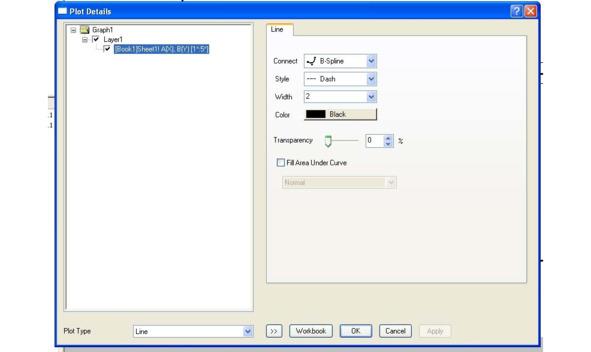 Теперь необходимо отформатировать саму кривую (см. рис. 1.12). Для этого необходимо дважды кликнуть на самой кривой мышкой. Откроется окно форматирования кривой. В этом окне выберите способ соединения элементов кривой Connect — B-Spline. Это встроенная в программу функция сглаживания экспериментальных данных B-сплайнами. Затем выберите стиль кривой Style. Например, черточки Dash. Выберите толщину кривой Width, например, 2. Затем выберите цвет кривой Color. Например, Black. Нажмите Apply, затем OK. График должен принять вид, который представлен на рисунке 1.13.