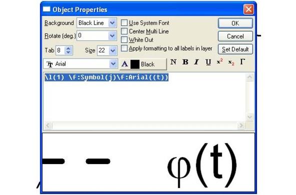 Следует позиционировать на графике легенду и произвести ее форматирование. Сначала кликнув мышкой и удерживая кнопку перетащите легенду в необходимую область графика. Затем нажмите на легенду правой кнопкой мышки и во всплывающем меню выберите пункт Properties. В области надписи введите элементы форматирования и подписи \l (1) \f: Symbol (j) \f: Arial ((t))