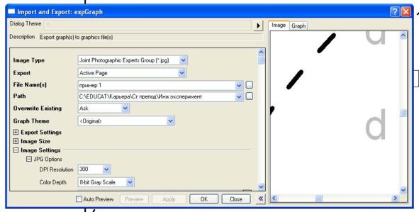 Для экспорта форматированного графика в графический файл необходимо в верхней панели выбрать пункт File и в ниспадающем меню выбрать пункт Export Graphs. Появиться окно работы с экспортом файла в диалоговом режиме. См. рис. 1.16. Выбирайте необходимый формат графического файла (Image Type). Как правило, необходимо осуществить экспорт в файл с расширением *.jpg. Укажите имя файла и путь к рабочему каталогу (File name и Path). Назовите файл, например, пример 1. Нажмите на раскрывающемся пункте Image Settings. Установите разрешение DPI Resolution — 300 (как правило, требуется именно такое разрешение) и глубину цветности 24-bit Color (цветной рисунок) или 8-bit Gray Scale (полутоновый рисунок). Нажмите Preview, чтобы увидеть предварительный вид экспортируемого графика. Нажмите Apply. Нажмите OK.