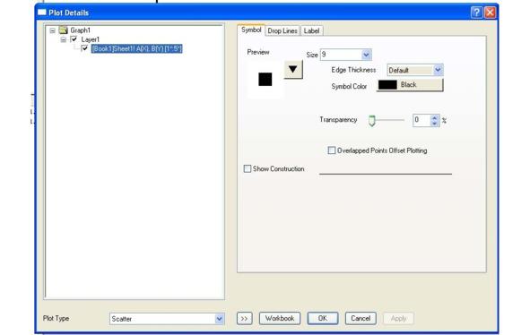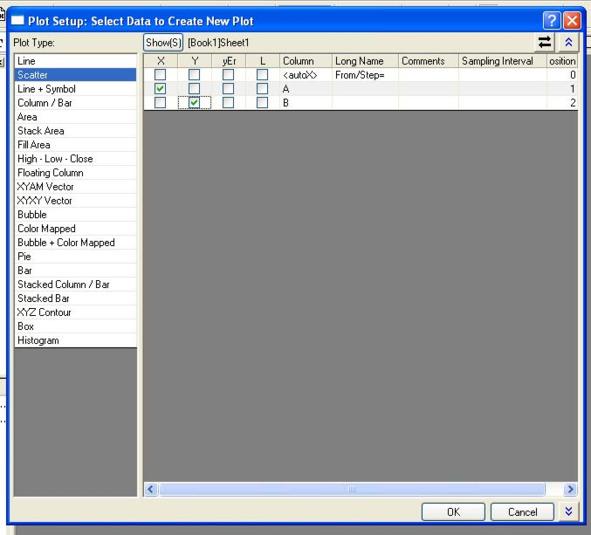Согласно инструкциям, освоенным на первом занятии необходимо ввести табличные данные в рабочую книгу Book 1. Затем в верхней панели выбрать пункт Plot. В ниспадающем меню следует выбрать пункт Symbol. В открывшемся боковом меню необходимо выбрать пункт Scatter. Откроется окно с установками графика, которое представлено на рис. 1.18. Необходимо поставить в соответствие X столбцу аргумента A, Y столбцу значений функции B.