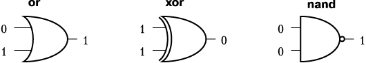 Вместо того чтобы использовать значения «истина» и «ложь», мы используем 1 и 0 в качестве значений битов, входящих и выходящих из вентилей.