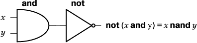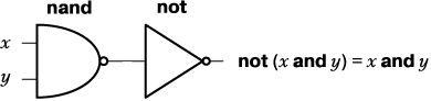 Обратите внимание, что вентили можно составлять, получая другие вентили. Мы можем построить and из вентилей nand и not.