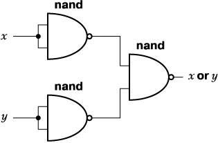 | Каждый логический вентиль может быть представлен как комбинация вентилей nand. То же самое верно и для вентилей nor. Вентили nand и nor называются универсальными вентилями, потому что они обладают этим свойством [7]. |