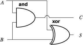 где A, B, S и C — это биты. Указанная схема берет два одиночных входных бита, A и B, и выдает двухбитный ответ CS: